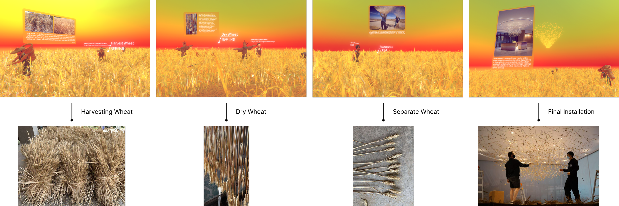 The construction of this installation is deeply rooted in the wheat fields of Zhengzhou, China, where we harvested, dried, and processed the materials locally. Because pandemic restrictions prevented the artist, Nati, from selecting materials in person, we used 360 degree photography to create an immersive VR environment. This allowed him to virtually 'step into' the field and experience the texture of the harvest from afar. We now aim to translate this journey into a VR experience for the public, offering visitors a deeper understanding of the installation’s origins.