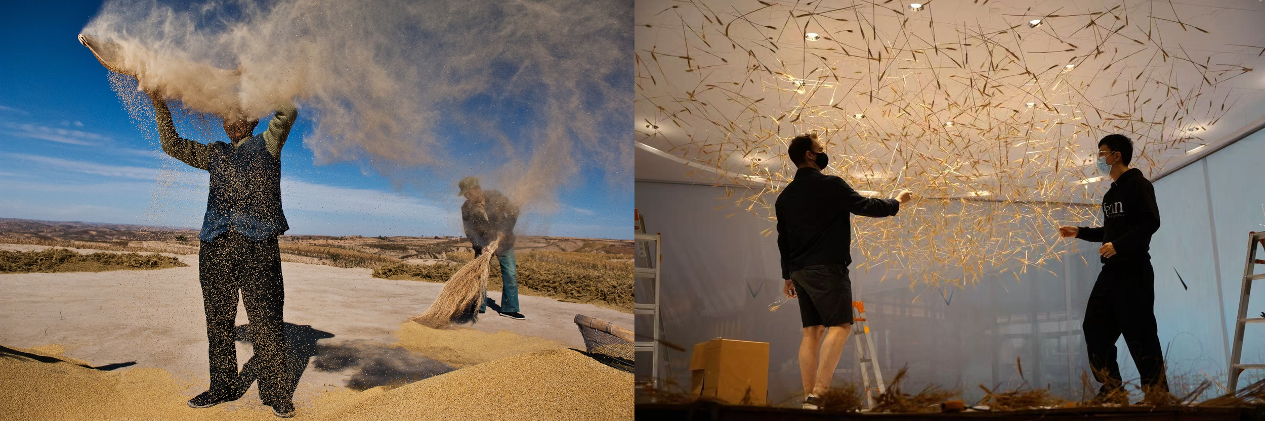 Me and Nati working on the installation like the traditional Chinese farmers collaborating to winnow to separate wheat shell from its core.